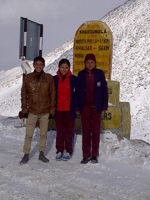 Am Ende dieses Lehraufenthaltes nahm Sensei H.-Peter Staudt die drei Übungsleiter Stanzin Nurbu, Sonam Yangzes und Rigzin Cuhskit (v.l.n.r.) als Anerkennung für ihren Einsatz mit auf den höchsten befahrbaren Pass der Welt, den Khardung La, auf 5.600 m Höhe .